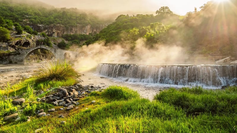 Turen bringer os videre til de berømte termiske kilder ved Benja – et sandt naturvidunder. Her har det varme, mineralrige vand strømmet i århundreder og siges at have helbredende egenskaber. Vi har tid til at nyde et afslappende bad i de naturlige bassiner, mens vi betragter de gamle osmanniske stenbuer, der spænder over floden og giver stedet en næsten eventyrlig atmosfære. Omgivelserne er præget af den naturskønne Langarica-kløft og en dal, der indbyder til ro og fordybelse.